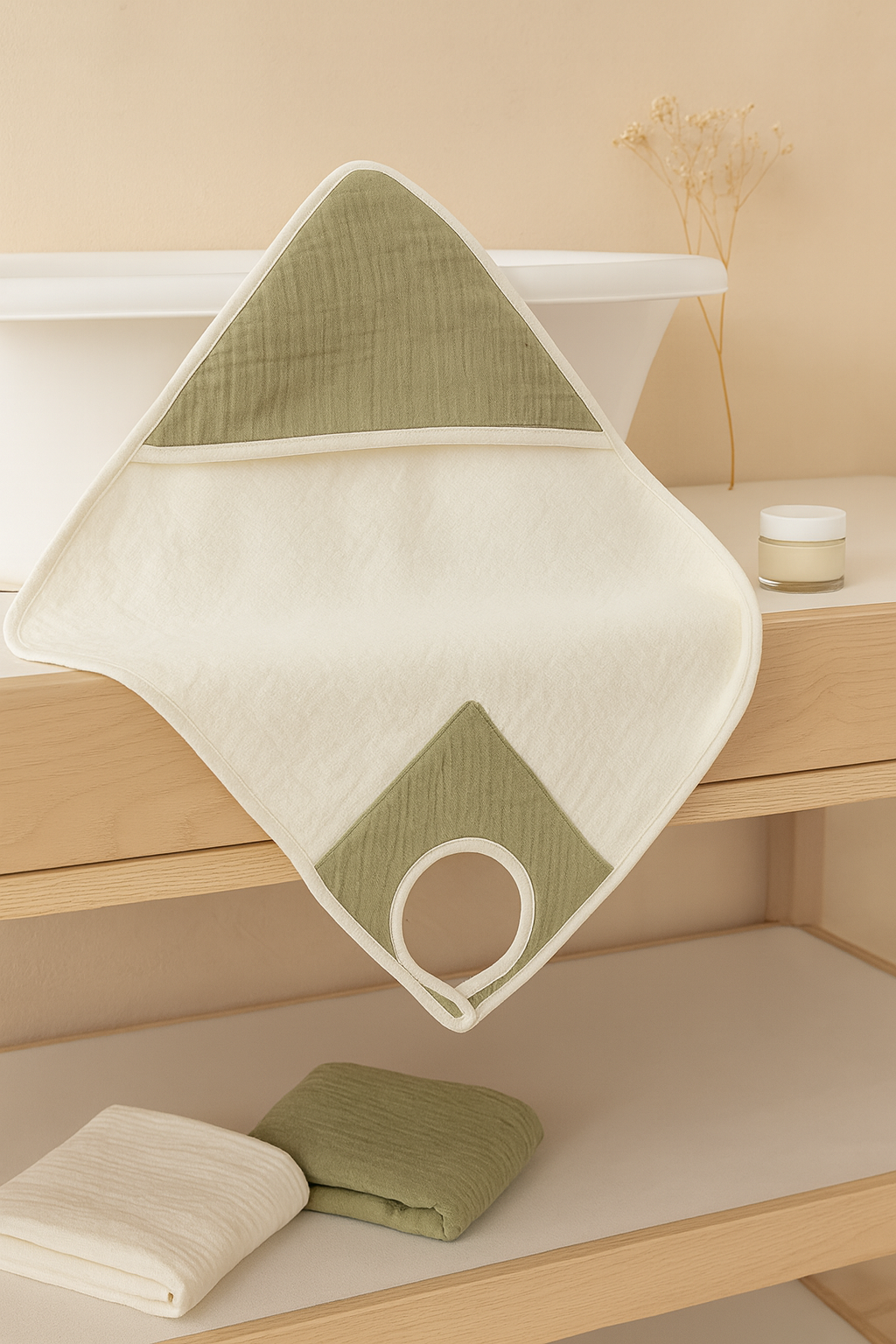 Imaginée pour offrir confort et sérénité aux jeunes parents, notre cape de bain tablier facilite le moment du bain tout en douceur.
